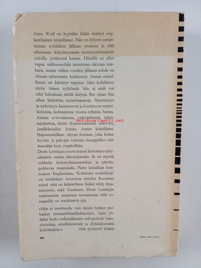 Tyydyttävä. Tarkempi kuntoluokka: K2+ ; Hieman tahraisuutta kansissa, hieman repeämää reunoilla, hieman kulumaa, sivut vielä osittain leikkaamatta auki eli osittain lukematon kirja, kansien reunoilla taittumaa ja rispaantumaa (koska ohuehkot kannet sivuja leveämmät), selkämyksessä lukutaittumaa, sivut siistit ja hyväkuntoiset