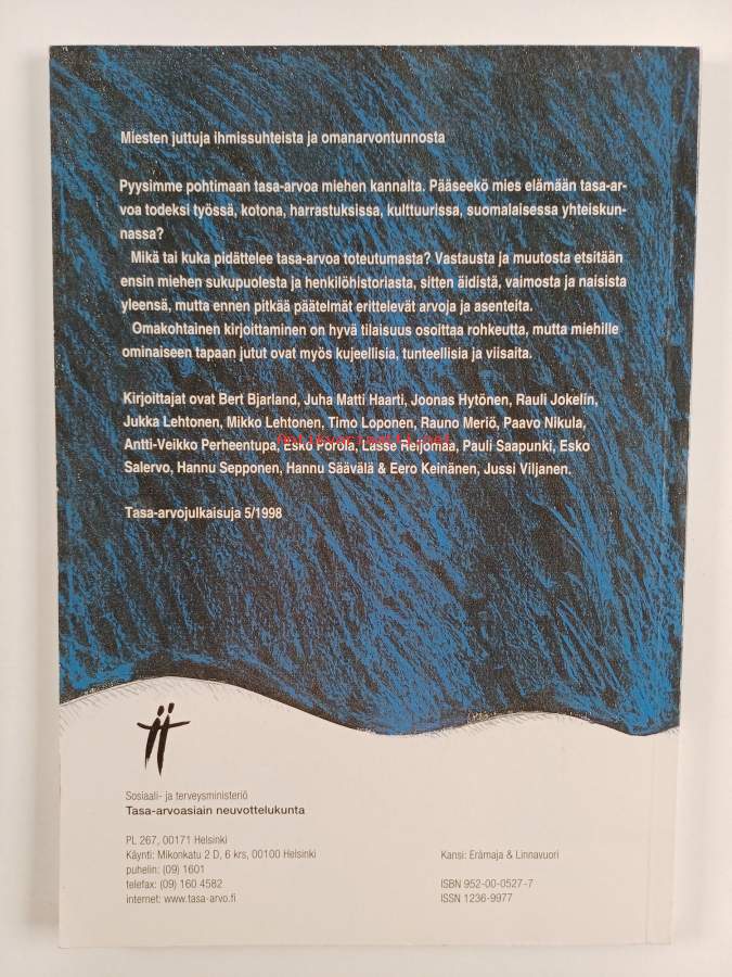 Muu(t) tekijä(t): Arto Tiihonen, Matti LinnavuoriMerkinnät: omistajamerkintäSarja: Tasa-arvojulkaisuja 1998, 5Asiasanat: elämäntapa, ihmissuhteet, kokemukset, identiteetti, isyys, perhe, miehet, sukupuoliroolit, mieheys, miehen asema, tasa-arvo, sukupuoli, roolit, mielipiteet, yhdenvertaisuus, mänskliga relationer, erfarenheter, könsroller, jämställdhet, män, mansrollen, identitet (självbild), mieskulttuuri, manskultur, mannens ställning, åsikter