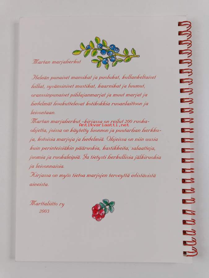 Muu(t) tekijä(t): Arja Hopsu-Neuvonen, Kaisa HärmäläAsiasanat: ruokaohjeet, ruoanvalmistus, leivonnaiset, leipominen, salaatit, jälkiruoat, marjat, juomat, puurot, matrecept, drycker, matlagning, bakning, bakverk, sallader, bär, efterrätter, grötar