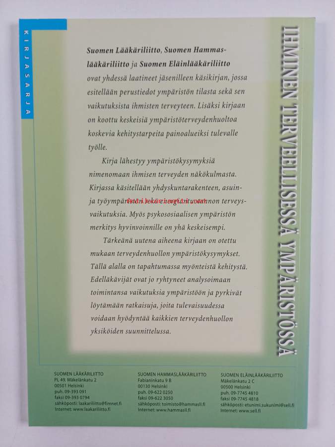 Muu(t) tekijä(t): Antti Pönkä, Satu Alaluusua ym.Sarja: Kirjasarja / Suomen lääkäriliittoAsiasanat: terveysvaikutukset, terveys, asuminen, ympäristön tila, elinympäristö, terveyskasvatus, energiantuotanto, terveydenhuolto, ympäristökysymykset, ympäristö, työolot, ympäristöterveydenhuolto, vaaratilanteet, yhdyskuntarakenne, yhdyskunnat, ympäristöonnettomuudet, ympäristöterveys, environment, hälsa, hälsoeffekter, miljö, environmental exposure, hälso- och sjukvård, boende, Health, hälsofostran, livsmiljö, miljöfrågor, energiproduktion (industri), arbetsförhållanden, miljöns tillstånd, terveydensuojelu, environmental health, miljöhälsovård, farliga situationer, miljöolyckor, miljöhälsa, samhällen, samhällsstruktur (områdesstruktur), hälsoskydd