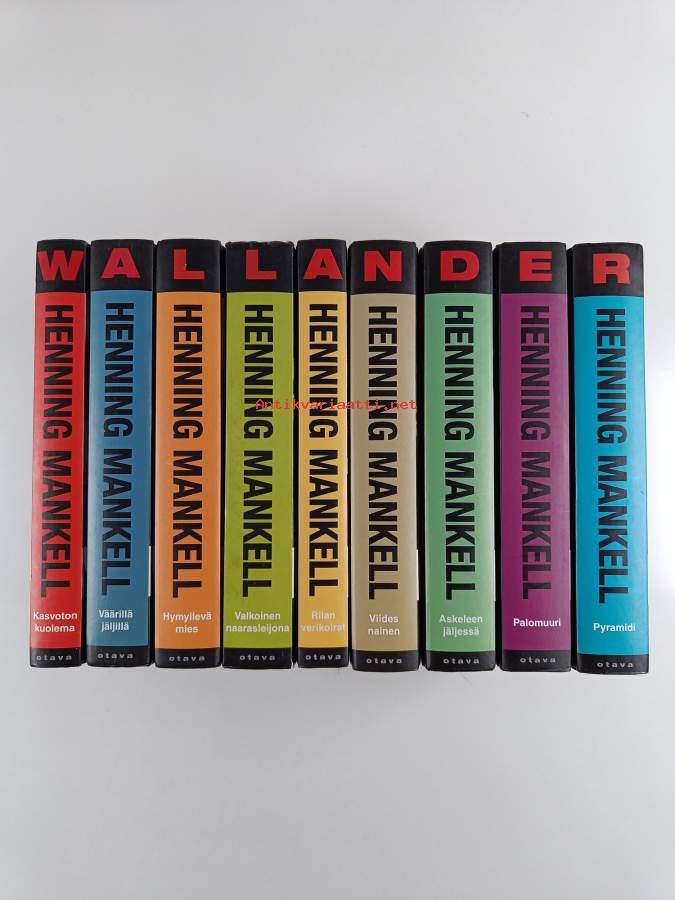 Koko nimi: Wallander -setti (9 kirjaa) : Kasvoton kuolema ; Riian verikoirat ; Valkoinen naarasleijona ; Hymyilevä mies ; Väärillä jäljillä ; Viides nainen ; Askeleen jäljessä ; Palomuuri ; Pyramidi