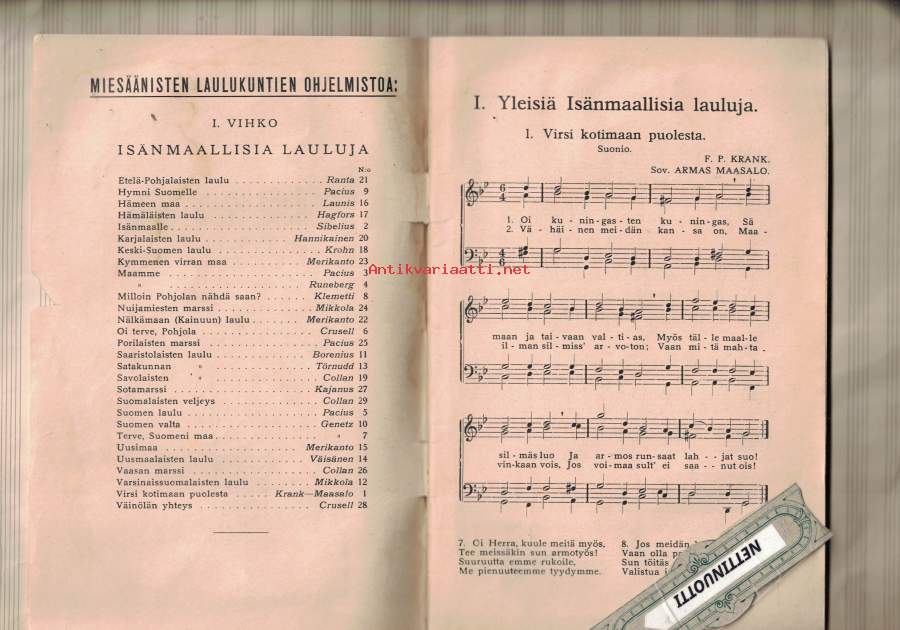 Sis. 29 laulua, mm: Etelä-Pohjalaisten laulu, Sulho Ranta - Hymni Suomelle, Pacius - Hämeen maa, Armas Launis - Isänmaalle, Sibelius - Maamme, Pacius - Nuijamiesten marssi, Viljo Mikkola - Nälkämaan laulu, O. Merikanto - Saaristolaisten laulu, Borenius - Sotamarssi, Kajanus - Vaasan marssi, Collan - Väinölän yhteys, Crusell - ym.-Ei merkintöjä.-Pieni Helposti kuori
