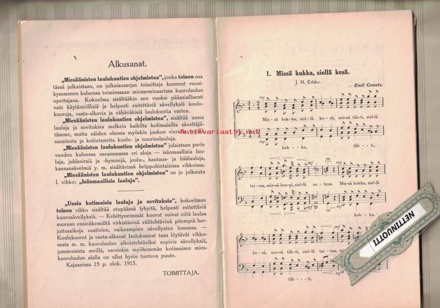 Sis. 17 laulua, mm: Missä kukka siellä kesä, Genetz - Kansalaislaulu, Klemetti - Aamulaulu, Otto Kotilainen - Sarkatakki, I. Krohn - Meidän maa, Maasalo - Merellä olen minä syntynyt, O. Merikanto - Vappulaulu, Melartin - Lippari, Emil Sivori - ym.