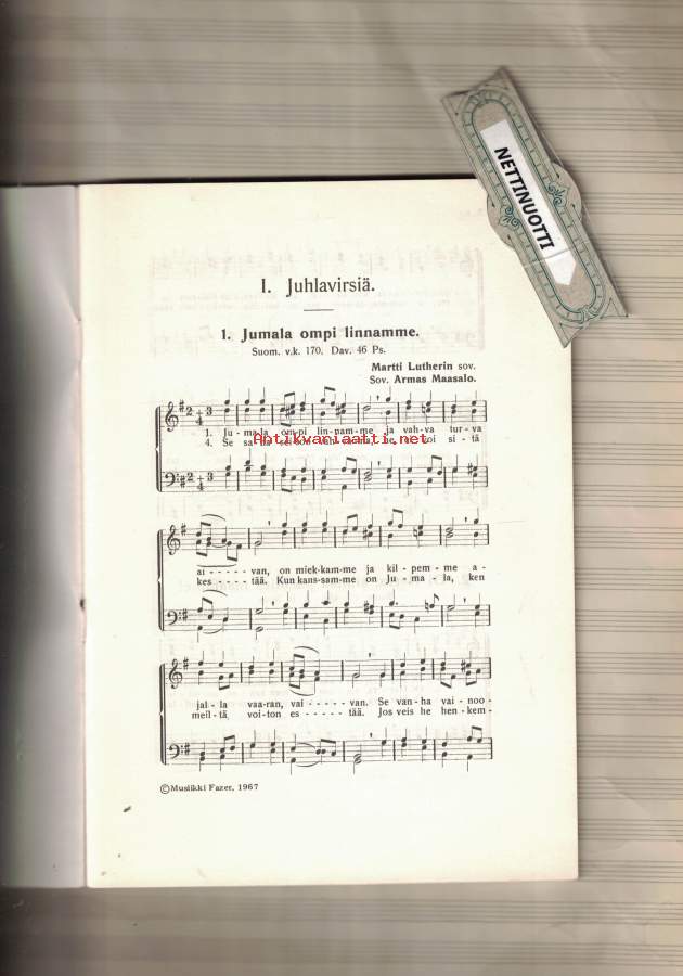 Sisällysluettelo:I Juhlavirsiä: Jumala onpi linnamme ; Oi Herra, siunaa päämies maamme ; Kaikkivoipa Jumalamme ; Sen suven suloisuutta ; Daavid, pyhä profeetta.II Hymnejä: Soi kiitokseksi Luojan / Sibelius ; Jumalan kunnia luonnossa / Beethoven ; Maailman portit auetkohot / Gluck ; Mun paimen Herra on / Klein ; Kiitos ja kunnia Herralle / Rinck.III Joululauluja: Enkeli taivaan / Luther ; Cunnioittakam' Cristust' / Sivori sov. ; Jouluaattona / Hannikainen-Maasalo ; Riemuitkaam' sydämestä / Klemetti ; Maailman pitkään pimeyteen / Klemetti sov. ; Joulukellot / Maasalo ; Joululaulu / Sibelius ; Jouluyön laulu / Pretorius ; Vanha joululaulu / Pretorius ; Joulujuhla ; Jouluyö / Cruber ; Uudenvuoden virsi / Maasalo sov.-Ei merkintöjä.-Pieni Helposti kuori