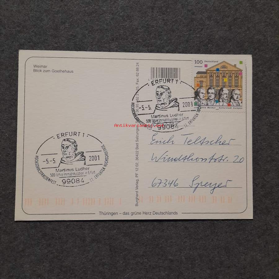 Saksa erikoisleima kortti, Saksalaiset erikoisleima-postikortit paikkakuntakortti, käytetty, matkailukortti ERFURT 1 5.5.2001MARTINUS LUDHER 500 JAHRE