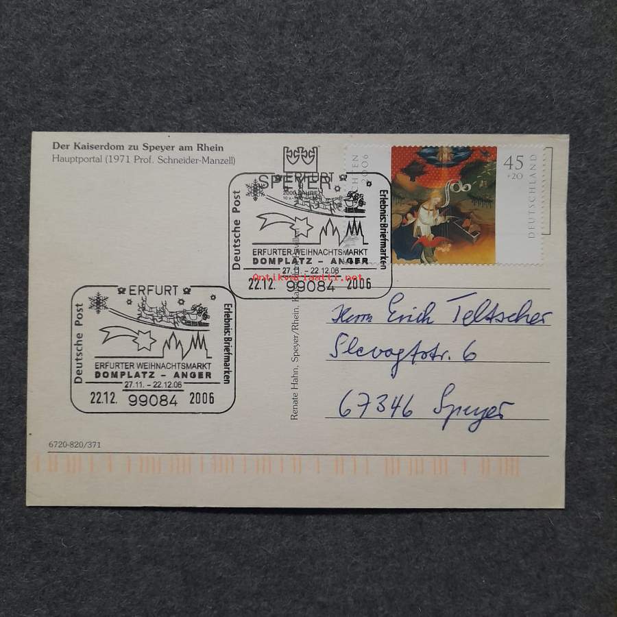 Saksa erikoisleima kortti, Saksalaiset erikoisleima-postikortit paikkakuntakortti, käytetty, matkailukortti ERFURT DOMPLATZ - ANGER 27.11-22.12,06
