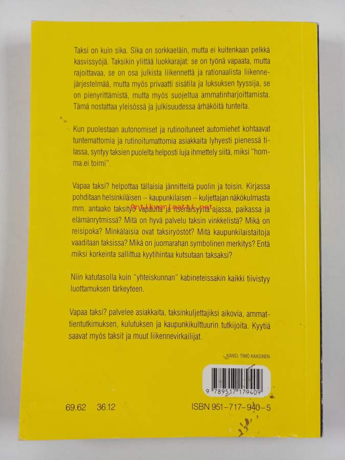 Sarja: Suomalaisen Kirjallisuuden Seuran toimituksia 652Asiasanat: elämäntapa, kaupunkikulttuuri, työnsosiologia, sosiaalinen vuorovaikutus, kuljetusala, ammatti-identiteetti, taksit, työpaikkakulttuuri, taksinkuljettajat, palveluammatit