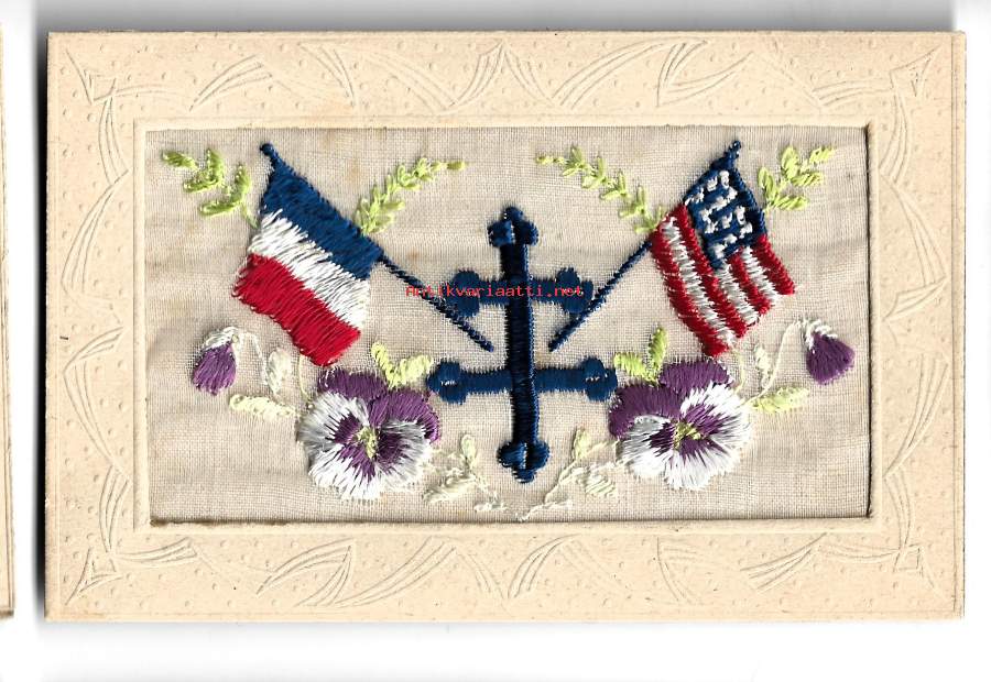 Brodeerattu postikortti, jossa on Yhdysvaltain ja Ranskan liput, Lothringenin kaksoisristi ja orvokkeja. Tyyppi: Brodeerattu silkki-aiheinen postikortti.Aihe: Yhdysvaltain ja Ranskan liput, Lothringenin risti (symboli Ranskan vastarinnalle toisessa maailmansodassa).