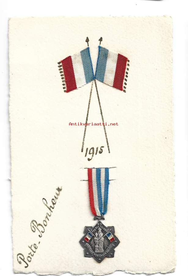 Ensimmäisen maailmansodan aikainen ranskalainen onnenkalu, mahdollisesti mitali tai merkki, joka on kiinnitetty korttiin. Kortissa on ranskankielinen teksti "Porte Bonheur" (onnenkalu) ja vuosiluku "1915" sekä pienempiä tekstejä itse mitalissa. KäännösPorte Bonheur: OnnenkaluigisSUOJELKAA MEIDÄN RAKKAITA SOTILAITAMME.