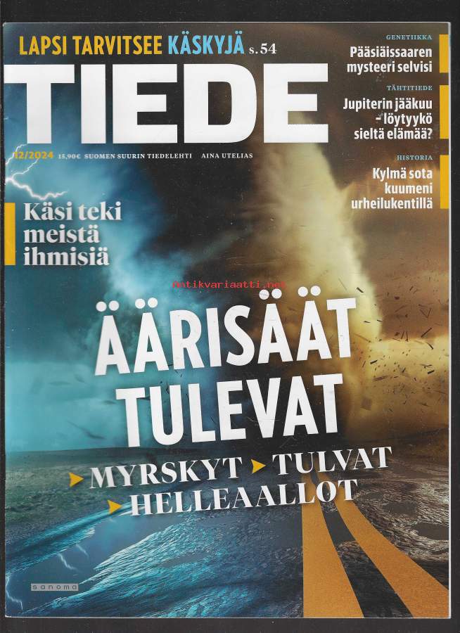 Tiede N:o 12/2024. Äärisäät tulevat. Jupiterin jääkuu. Käsi teki meistä ihmisiä. Kylmä sota kuumeni urheilukentillä. Lapsi tarvitsee käskyjä.