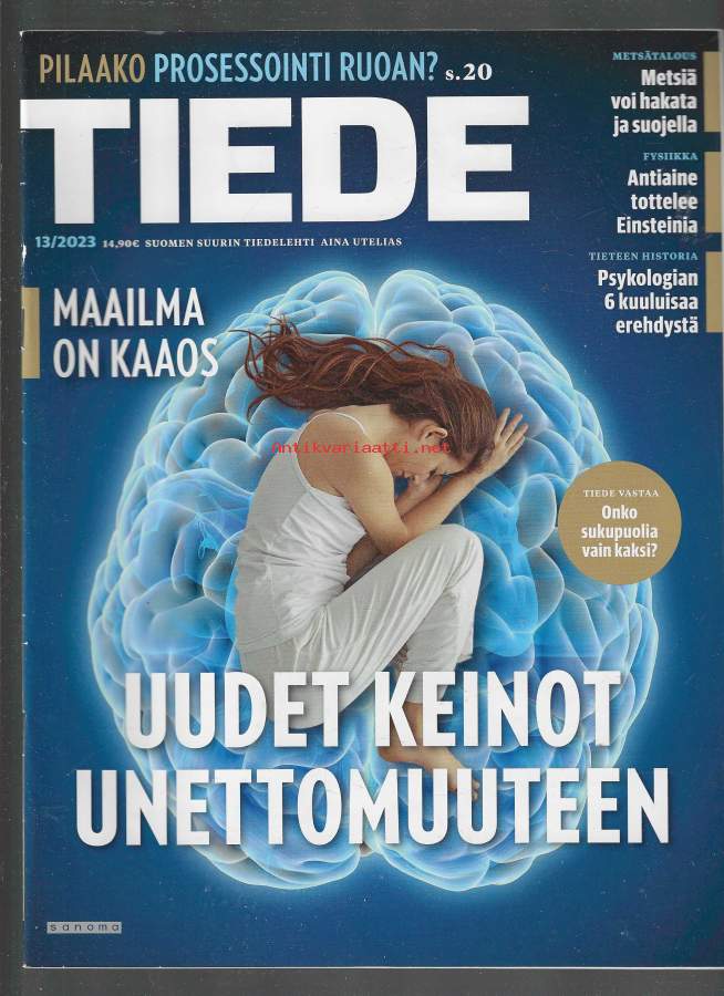 Tiede N:o 13/2023. Uudet keinot unettomuuteen. Maailma on kaaos. Pilaako prosessointi ruoan? Onko sukupuolia vain kaksi? Metsiä voi hakata ja suojella.