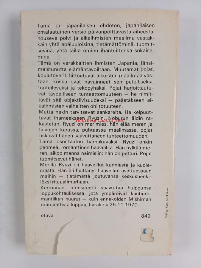 Hyvä. Tarkempi kuntoluokka: K3+ ; Hieman kulumaa, selkämyksessä aavistus vinoutta. Kansipaperin kunto: joitain repeämiä/kulumaa