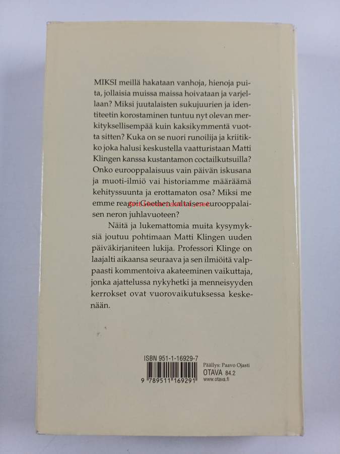 Hyvä. Tarkempi kuntoluokka: K3+ ; Pienoista kulumaa reunoilla ja kulmissa, selkämyksessä hieman vinoutta. Kansipaperin kunto: pienoista kulumaa reunoilla, muuten erinomainen