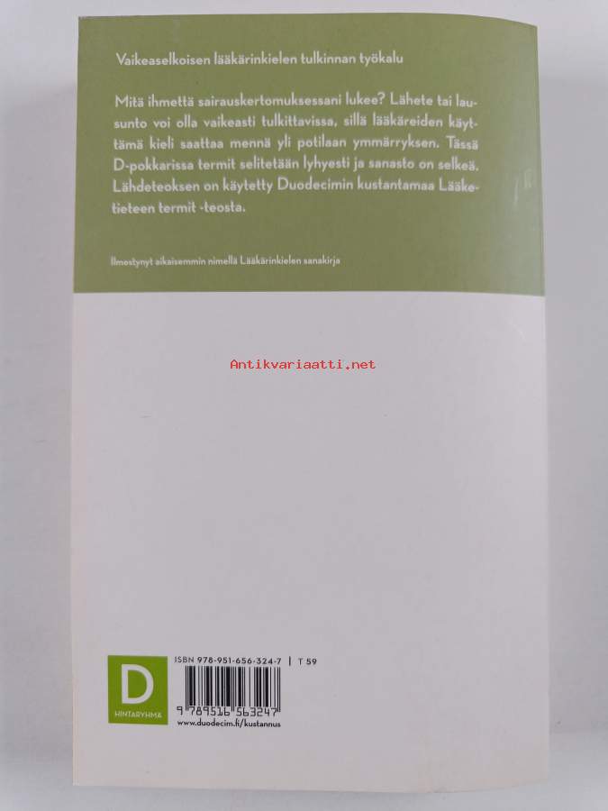 Muu(t) tekijä(t): Hannu NuutinenSarja: D-pokkari; D-pokkaritAsiasanat: sanakirjat, lääketiede, terminologia, latinan kieli, lääkärit, ammattikieli, Medicine, Dictionaries, Medical, sairauskertomukset
