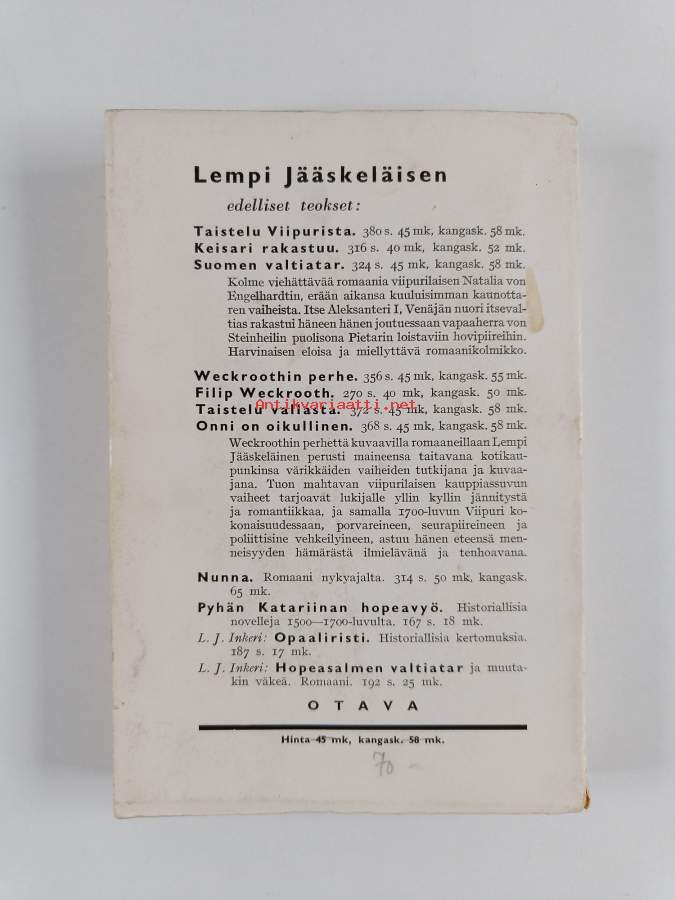 Huonokuntoinen (lukukelpoinen). Tarkempi kuntoluokka: K1+ ; Hieman kulumaa kansissa, hieman repeämää selkämyksen päissä, selkämyksessä hieman vinoutta, selkämyksessä lukutaittumaa. kannet irti