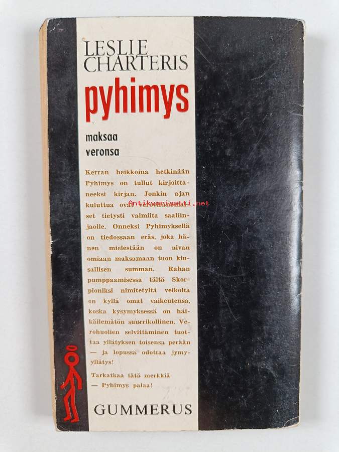 Pyhimys näkee unia, 1965. 1. painos.Pyhimys eli Simon Templar on todella erilainen kuin muut rikosromaanien sankarit. Hän on eräänlainen nykyajan Robin Hood,