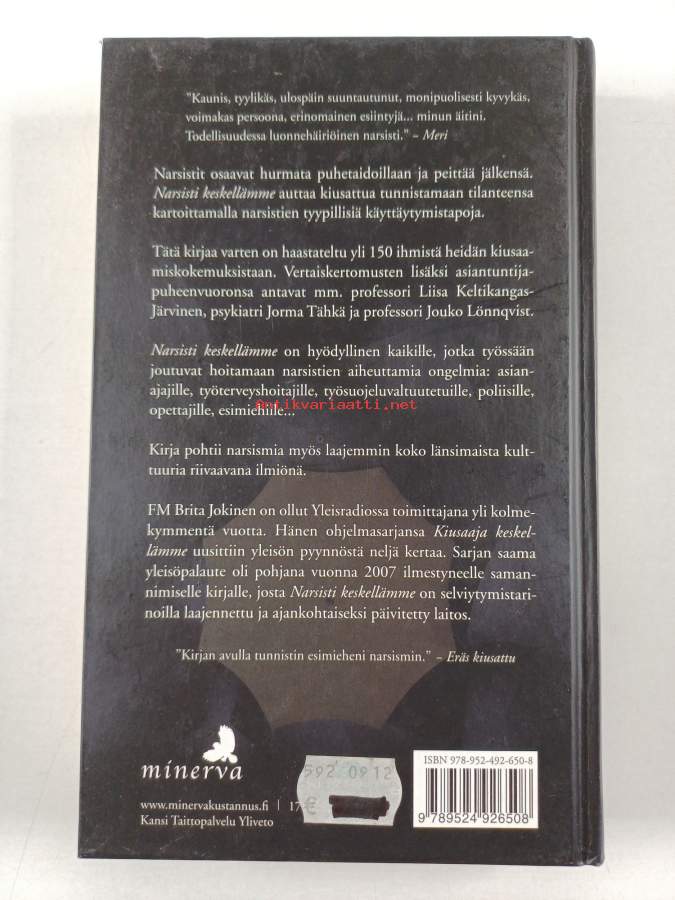 Muu(t) tekijä(t): Brita JokinenAsiasanat: ihmissuhteet, parisuhde, kokemukset, työelämä, narsismi, selviytyminen, elämänhallinta, perhe, uhrit, persoonallisuushäiriöt, työpaikat, henkinen väkivalta, työpaikkakiusaaminen, kiusaaminen, luonnehäiriöt, narsistinen persoonallisuus, työpaikka