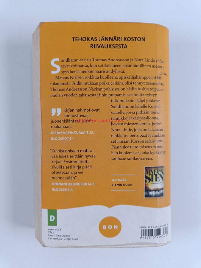 Muu(t) tekijä(t): Sirkka-Liisa SjöblomSarja: Bon; Sandhamnin murhat 4Alkuteos: I natt är du dödAsiasanat: murha, juristit, saaristot, sotilastukikohdat, saaret, poliisit, kosto, sisäkertomukset, simputus