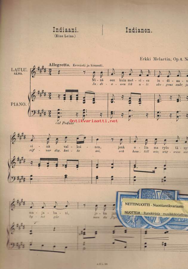 Laulu + piano: Minä metsän polkuja kuljen - Indiaani - Mirjamin laulu I - Mirjamin laulu II.- Postipaketti.