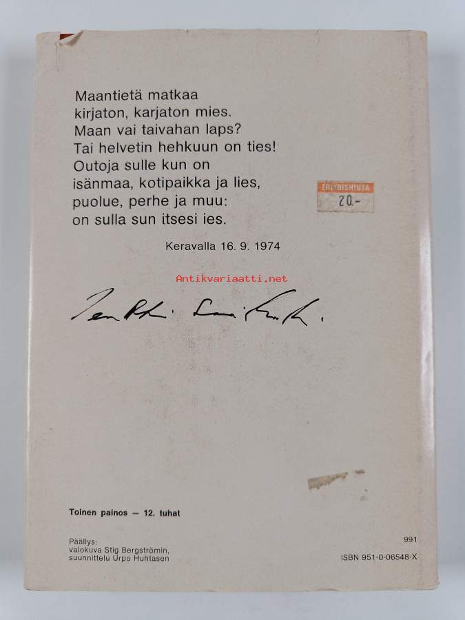 Hyvä. Hieman kulumaa, pienoista kolhua yläkulmissa, takana vanha hintalappu, takana hintalapun jäämää. Kansipaperin kunto: joitain repeämiä/kulumaa