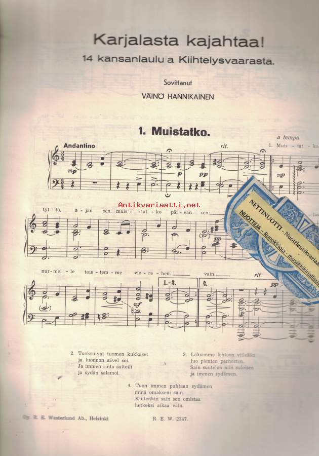 1. Muistatko, 2. Lumpeikkolammilla, 3. Poikia pyörii piirissä, 4. Satakieli, 5. Sellainen avain, 6. Punasella paatilla, 7. Koiratkin haukkuu kulkuria, 8. Ystävää ei olekaan, 9. Heilini syli, 10. Nuorella iälläni, 11. Mamman ruma lapsi, 12. Kymmenen riijua, 13. Nauris, 14. Ensimmäisenä iltana.-Suuri Helposti kuori