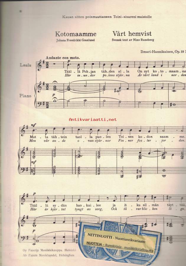 Kotomaamme, laulu pianon säestyksellä Op. 18 No2