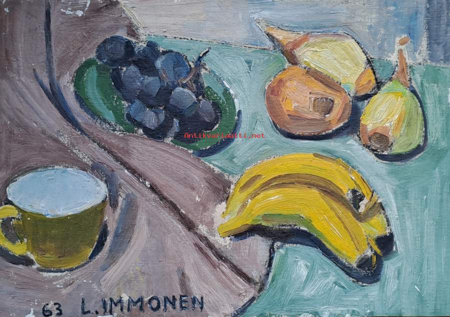 Leena Immonen. "Asetelma ja takan kubistiset kasvot" öljyvärimaalaus sign -63 kankaalle 38x53 cm kehystämätön