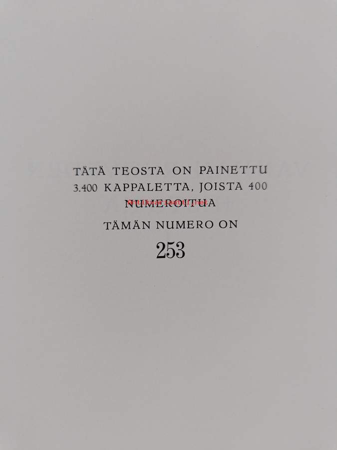 Hyvä. Tarkempi kuntoluokka: K3+ ; Hieman kulumaa, selkämyksessä hieman vinoutta. numero 253/400, liitoosassa kansipaperit joissa repeämiä ja tahraisuutta