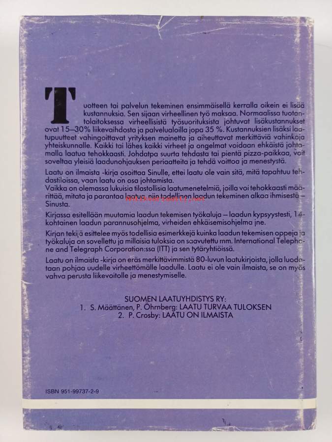 Muu(t) tekijä(t): Anna-Riitta VuorikoskiAlkuteos: Quality is free : the art of making quality certain