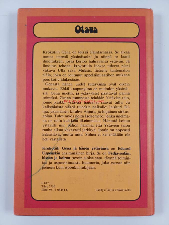 Muu(t) tekijä(t): Martti (suom.) Anhava, V. (kuvitus) AlfejevskiMerkinnät: omistajamerkintäAlkuteos: Крокодил Гена и его друзья (Gena i jego druzja)