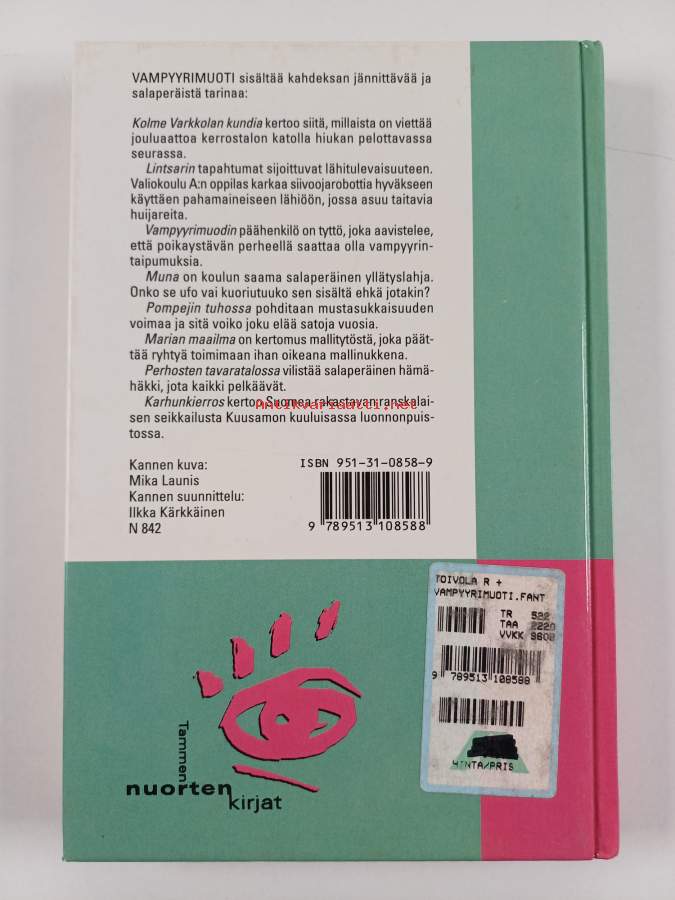Hyvä. Tarkempi kuntoluokka: K3+ ; Hieman kulumaa kansissa, pienoista kolhua selkämyksen päissä, takana vanha hintalappu