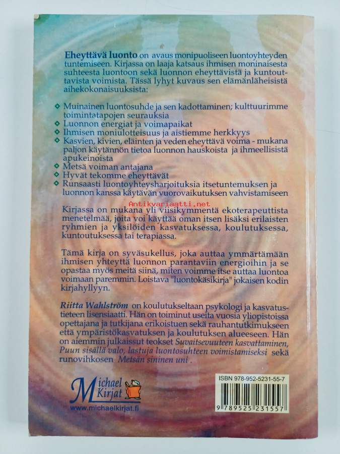 Asiasanat: luonto, ihminen, hoitomenetelmät, luonnonparannus, luontaishoito, elinympäristö, hyvinvointi, ihmiskuva, monikulttuurisuus, energia, kestävä kehitys, ympäristö, luontosuhde, ekologinen psykologia
