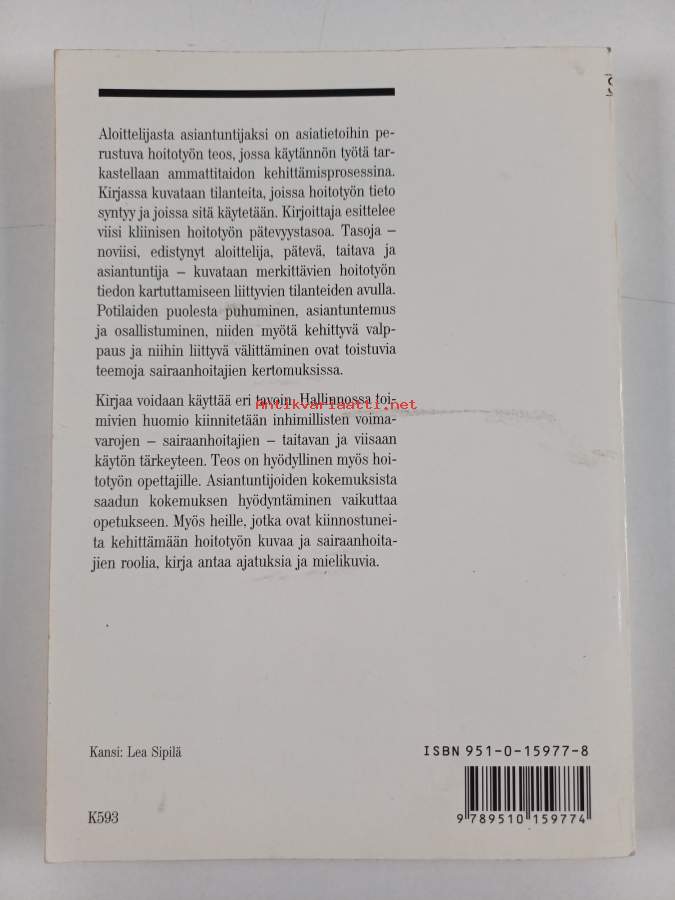 Muu(t) tekijä(t): Kristiina ToivanenMerkinnät: omistajamerkintäSarja: Sairaanhoitajien koulutussäätiön julkaisuAlkuteos: From novice to expert, excellence and power in clinical nursing practiceAsiasanat: diagnoosi, koulutus, laatu, auttaminen, hoitotyö, teoriat, vuorovaikutus, ammatillinen kehitys, potilaat, hoitohenkilöstö, ammattitaito, hallinto, sairaanhoitajat, sairaanhoito, hoitosuhde, toimenkuvat, hoitotiede, asiantuntijuus, ammattikuva, terveydenhuoltohenkilöstö, ammatti-identiteetti, asiantuntijat, professionalismi, laadunvarmistus, Nursing Care, hoitomyöntyvyys, potilasneuvonta, nursing process, Professional Competence, Clinical competence