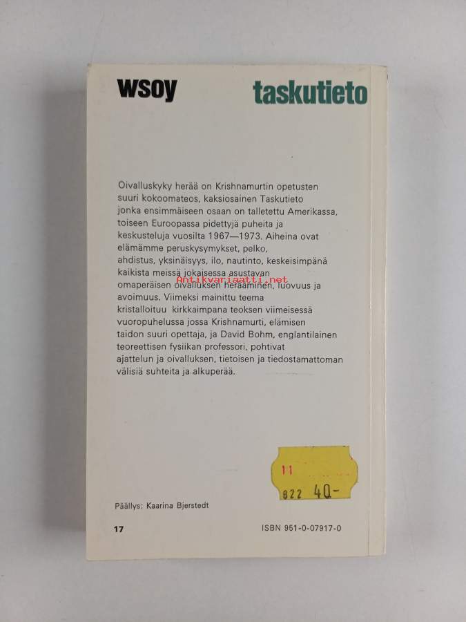 Hyvä. Tarkempi kuntoluokka: K3+ ; Hieman kulumaa kansissa, takana vanha hintalappu