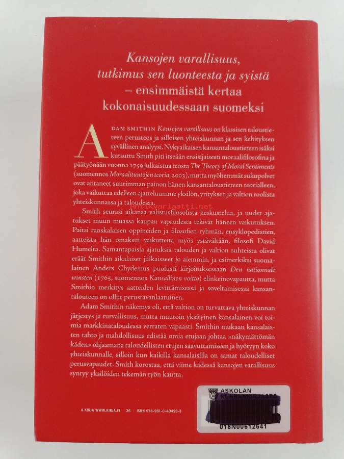 Muu(t) tekijä(t): Jaakko KankaanpääAlkuteos: An inquiry into the nature and causes of the wealth of nationsAsiasanat: taloustieteet, talous, Liberalismi, kansantaloustiede, klassikot, markkinatalous, yhteiskuntafilosofia, vapaakauppa, moraali, talousteoriat, poliittinen taloustiede, klassinen taloustiede