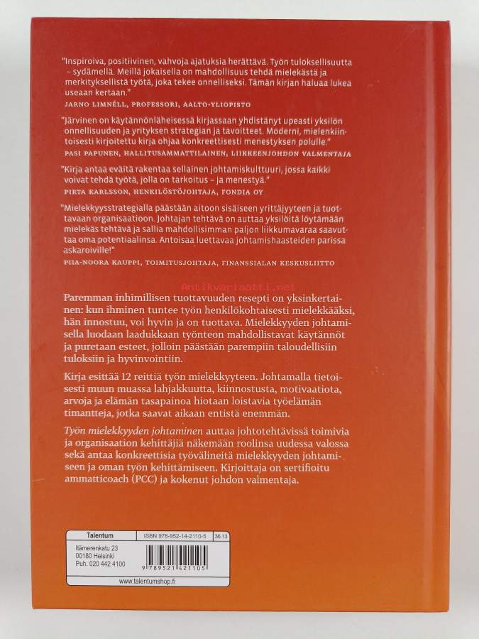 Asiasanat: johtaminen, kehittäminen, arvot, hyvä elämä, tuottavuus, työ, työhyvinvointi, motivaatio, henkilöstö, kehitys, lahjakkuus, organisaatiokulttuuri, työmotivaatio, mielekkyys, toimintamallit, esimiestaidot, merkitys, kiinnostus, kyvykkyys