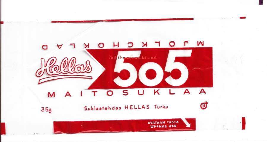 Hellas 505 Maitosuklaa - suklaakääre makeiskääre, makeiskääre 9x20 cm vuodelta 1955 / Oy Hellas Ab oli suomalainen makeisalan yritys, Turussa. Hellaksen
