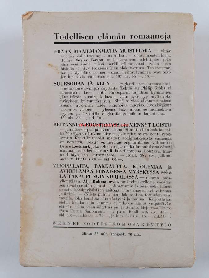 Tyydyttävä. Tarkempi kuntoluokka: K2- ; Pientä kulumaa, pientä repeämää selkämyksen päissä, hieman tahraisuutta, sidos löystynyt ja näkyvissä, kansien reunoilla taittumaa ja rispaantumaa (koska ohuehkot kannet sivuja leveämmät), selkämyksessä lukutaittumaa, selkämyksessä hieman vinoutta. suojanimiölehdellä mustekynällä tehty merkintä