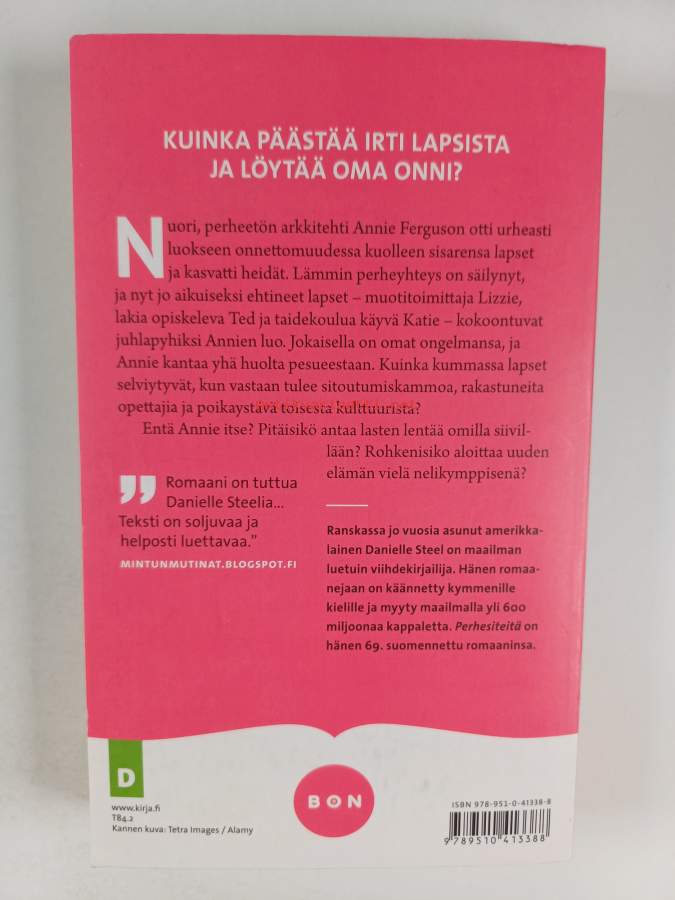 Muu(t) tekijä(t): Pirjo RutiSarja: BonAlkuteos: Family tiesAsiasanat: arkkitehdit, vanhemmuus, aikuistuminen, elämänmuutokset, orvot, kasvattilapset, sijaisvanhemmat, sisarukset, menetys