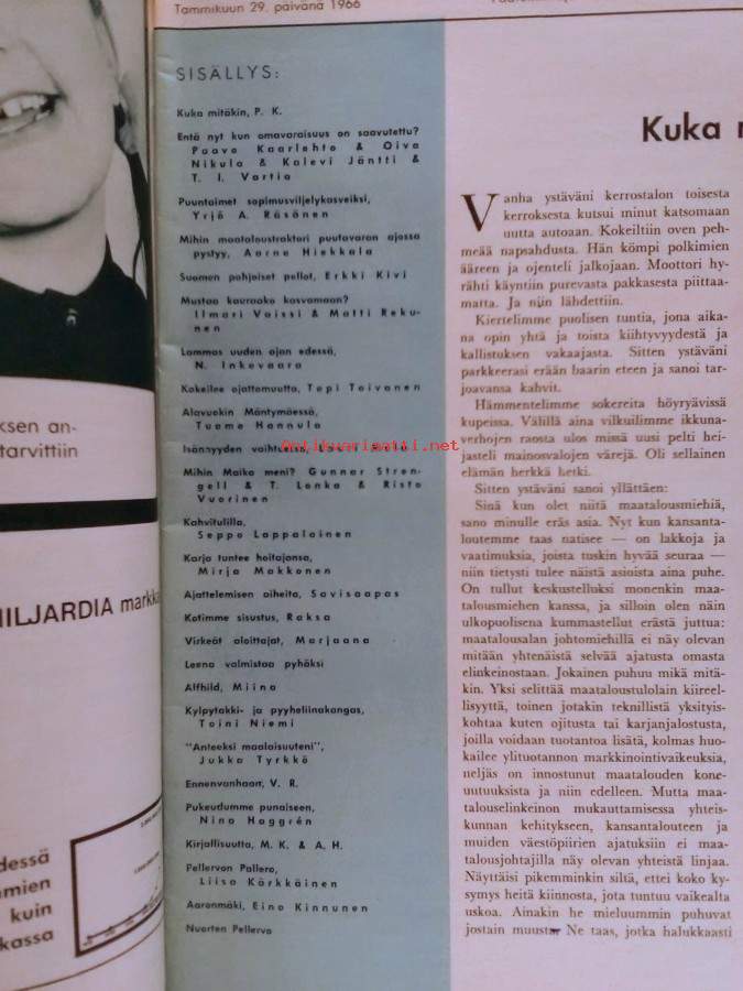 Ilmestynyt 29.1.1966, 56s., sisällysluettelo kuvassa, sisällys mm. Mustaa kauraako kasvamaan, Kokeile ojattomuutta, Alavuokin Alavuokki Mäntymäessä, Veikko Kankkonen