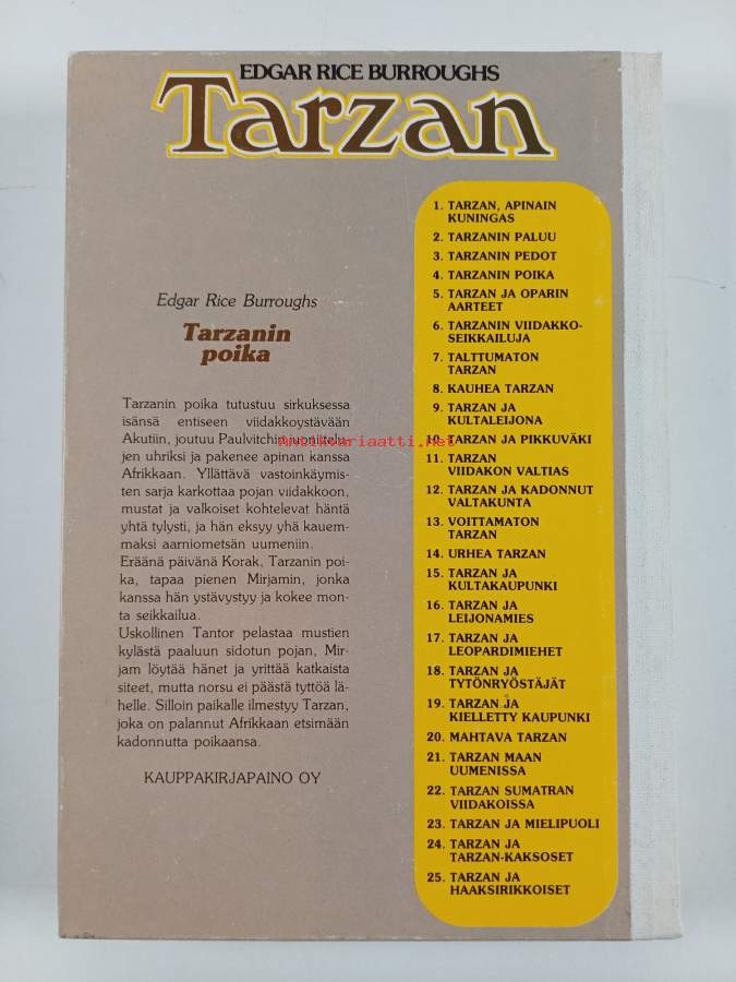 Tarzanin poika : seikkailuromaani Afrikan aarniometsistä / Edgar Rice Burroughs ; 14. englantilaisesta painoksesta suom. Valfrid Hedman.