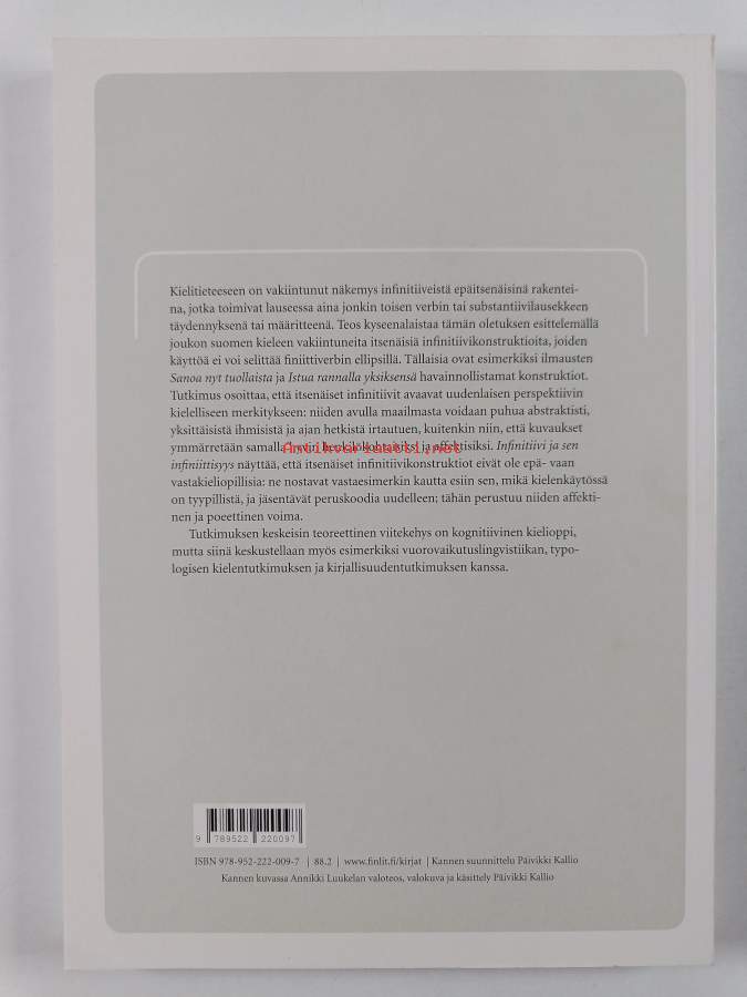 Sarja: Suomalaisen Kirjallisuuden Seuran toimituksia 1181Asiasanat: suomen kieli, verbit, lauseoppi, kognitiivinen kielioppi, affektiivisuus, infinitiivit