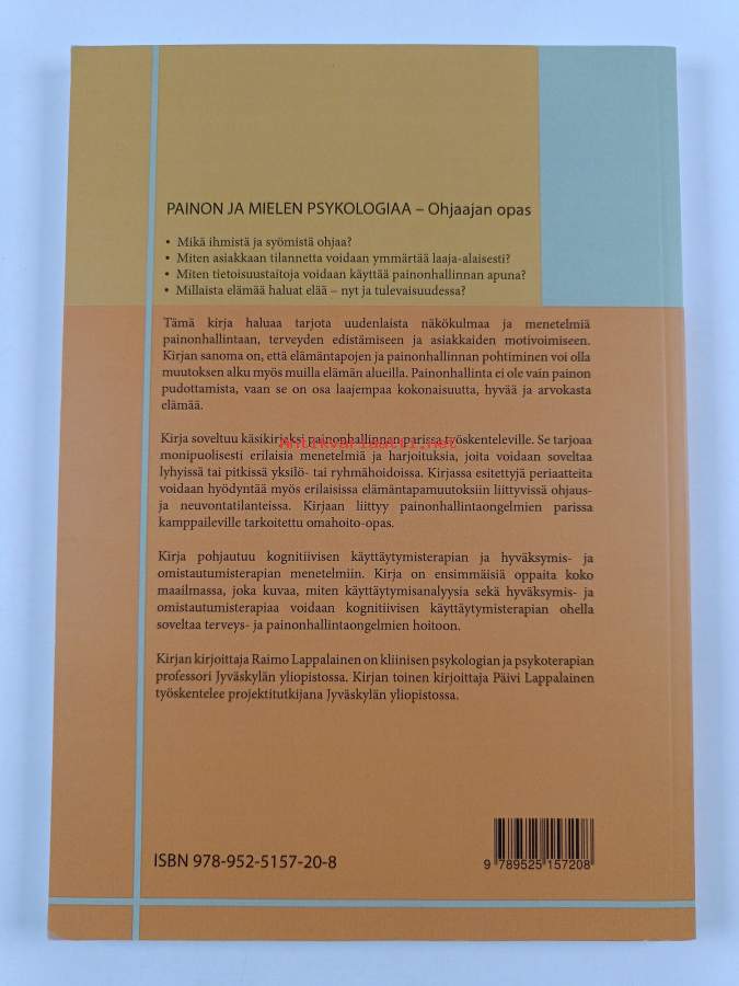 Muu(t) tekijä(t): Päivi LappalainenSarja: SKT:n julkaisusarja. Hoitomenetelmien julkaisuja 9.1Asiasanat: psykologia, hoitomenetelmät, muutos, psykoterapia, painonhallinta, terveyden edistäminen, ylipaino, lihavuus, syöminen, kognitiivinen käyttäytymisterapia, hyväksymis- ja omistautumisterapia, Health Promotion, Cognitive therapy, Food Habits, Obesity, Overweight, Behavior Therapy