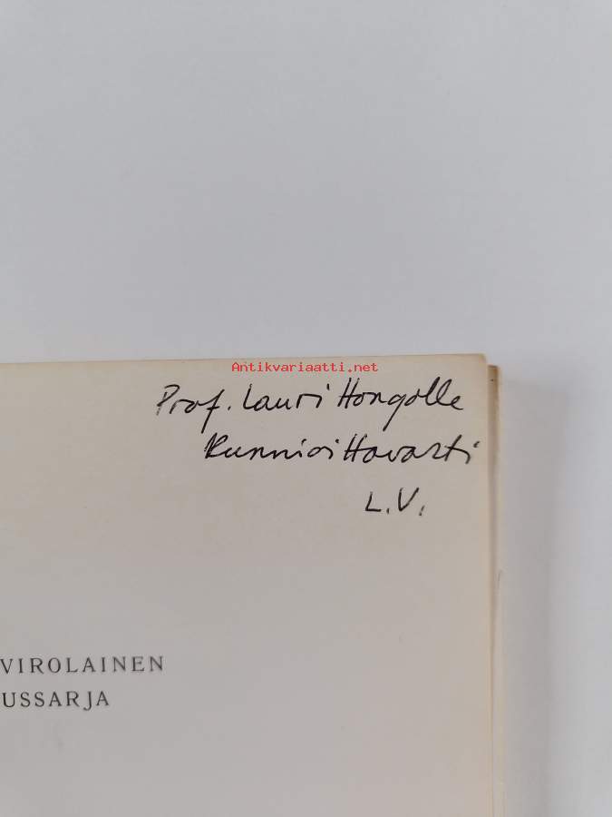 Hyvä. Tarkempi kuntoluokka: K3- ; Hieman kulumaa, pienoista tahraisuutta, muutamalla sivulla lyijykynämerkintöjä. tekijän nimikirjaimilla signeeraama omiste