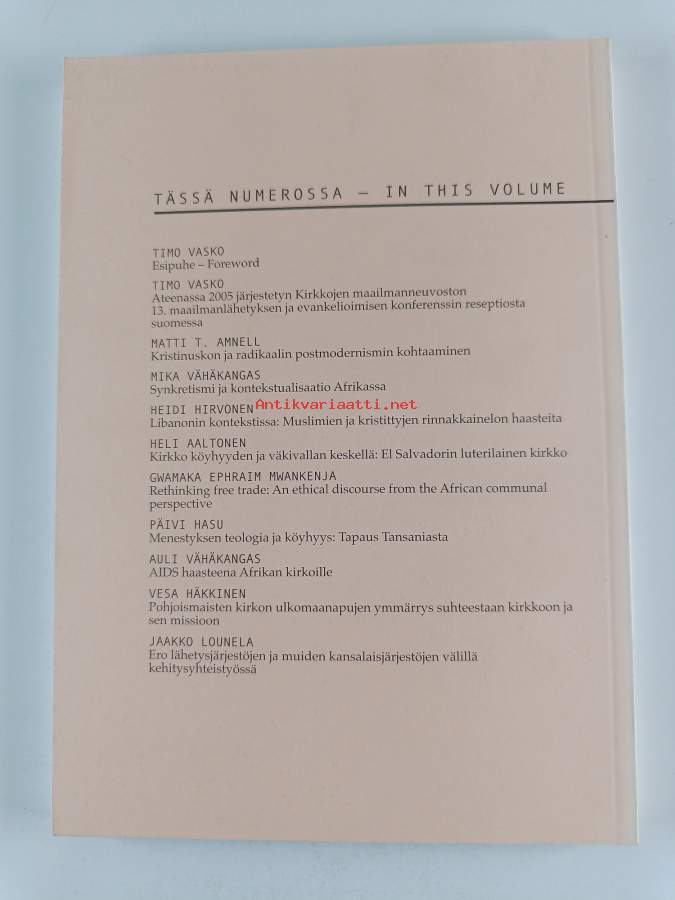 Muu(t) tekijä(t): Timo VaskoSarja: Lähetysteologinen aikakauskirja vol. 9Asiasanat: lähetystyö, islam, kristinusko, etiikka, kansainvälinen kauppa, kehitysyhteistyö, uusliberalismi, köyhyys, vapaakauppa, kehitysmaat, globalisaatio, AIDS, karismaattiset liikkeet, kirkon ulkomaanapu, postmodernismi, vapautuksen teologia, uskontoteologia, kontekstuaalinen teologia, synkretismi