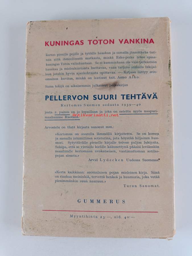 Tyydyttävä. Tarkempi kuntoluokka: K2+ ; Pientä kulumaa, pienoista tahraisuutta, pienoista repeämää, kansien reunoilla taittumaa ja rispaantumaa (koska ohuehkot kannet sivuja leveämmät)