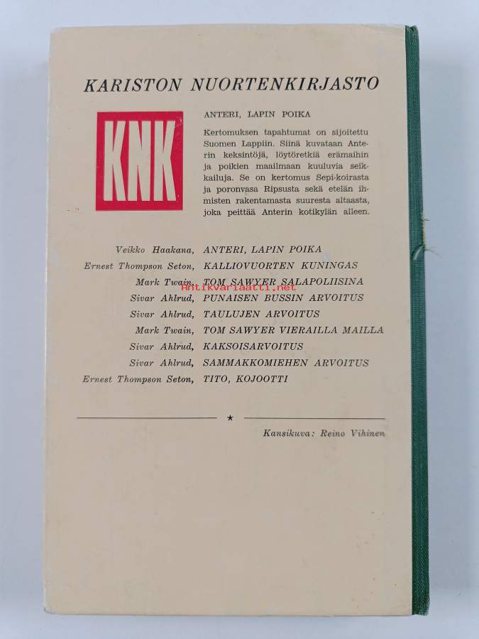 Huonokuntoinen (lukukelpoinen). Tarkempi kuntoluokka: K1+ ; Hieman tahraisuutta, pientä kulumaa, repeämää etukannessa, selkämyksessä hieman vinoutta