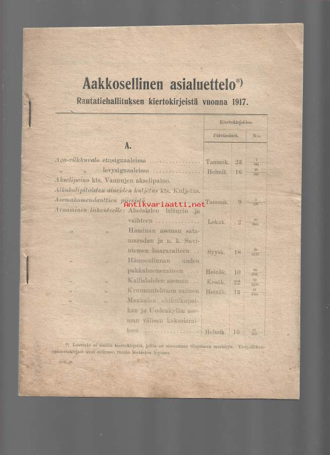 Valtionrautatiet Aakkosellinen asialuettelo Rautatiehallituksen kiertokirjeistä 1917 suomeksi ja ruotsiksi