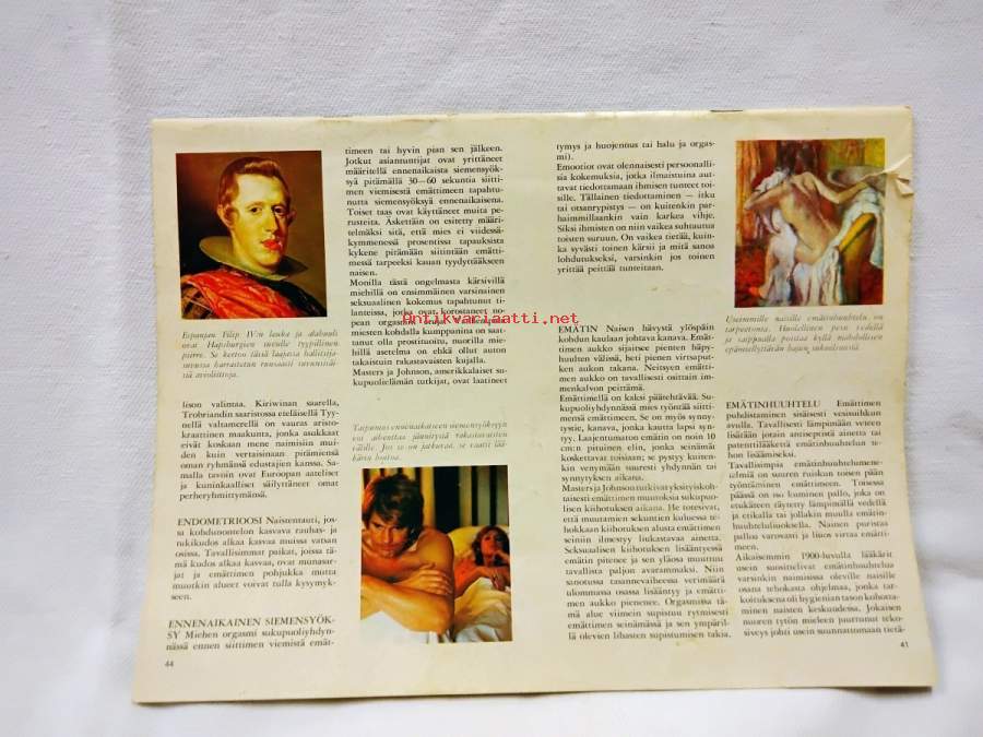 " Täydellinen tietoteos miehen ja naisen välisestä suhteesta, rakkaudesta. . . ", Ilmestynyt maaliskuu 1973, kansissa pientä rispaumaa, 32s., sisällys mm. Älä niele kiukkuasi, Onko nimi enne?, Sielu ja orgasmi, Äidin oma poika, Rooliaidat kaatumassa vs.naisen paikka on kotona, Asiantuntijan vastaanotolla: Kunhan isä tulee kotiin..., Kivekset