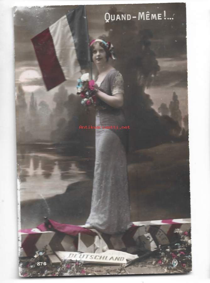 Tämä postikortti on ranskalainen ensimmäisen maailmansodan aikainen propagandakortti. Kortissa on nuori nainen Ranskan lipun kanssa, joka seisoo rikkinäisen saksalaisen rajamerkin päällä."Deutschland" (Saksa) -kyltti on rikki, mikä symboloi Ranskan voittoa tai toivetta siitä.Kortti on painettu ennen sodan päättymistä, ja sen tarkoitus oli nostattaa moraalia ja isänmaallisuutta Ranskassa.Kortin numero on 876.